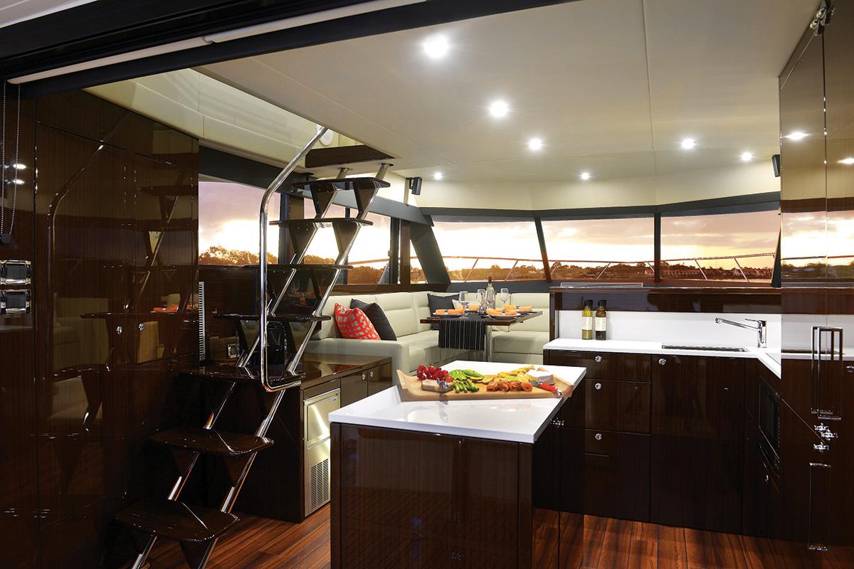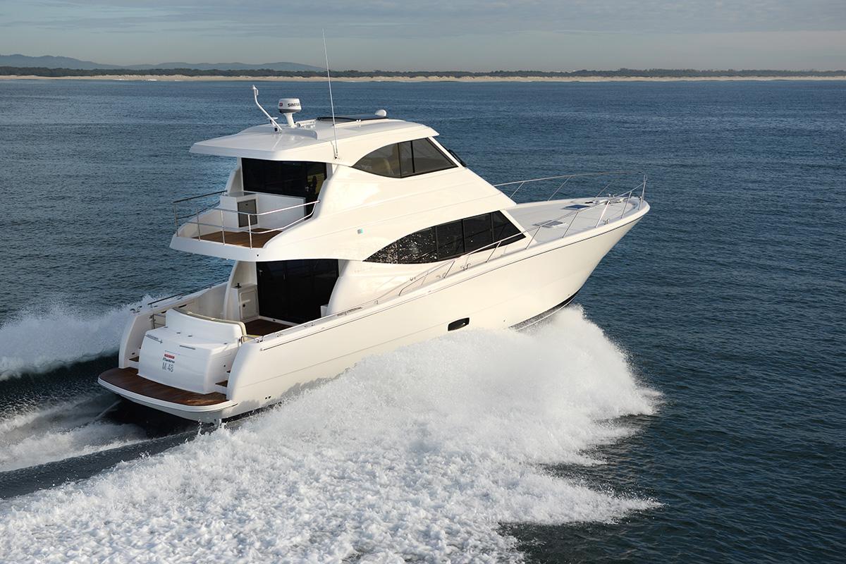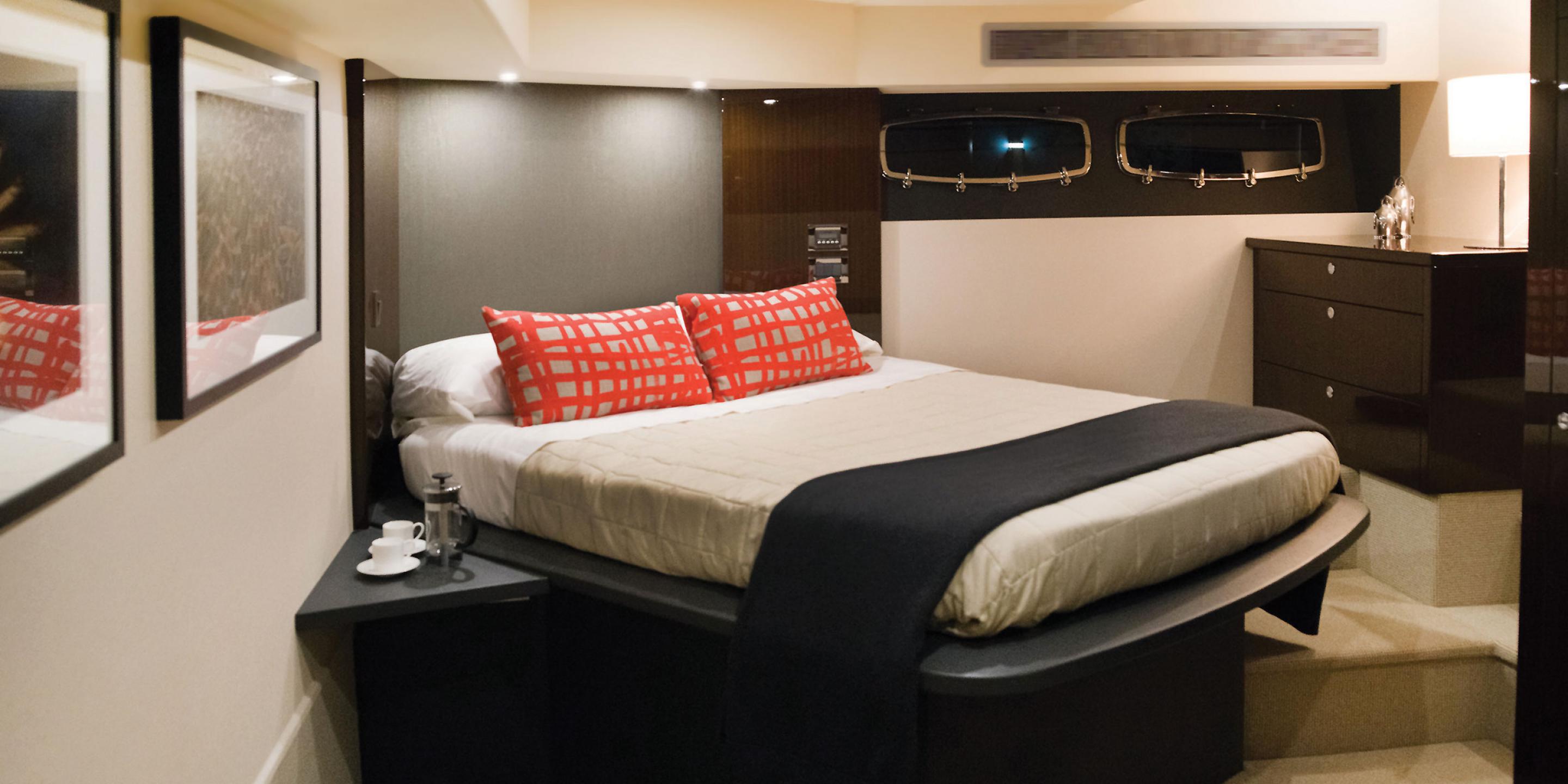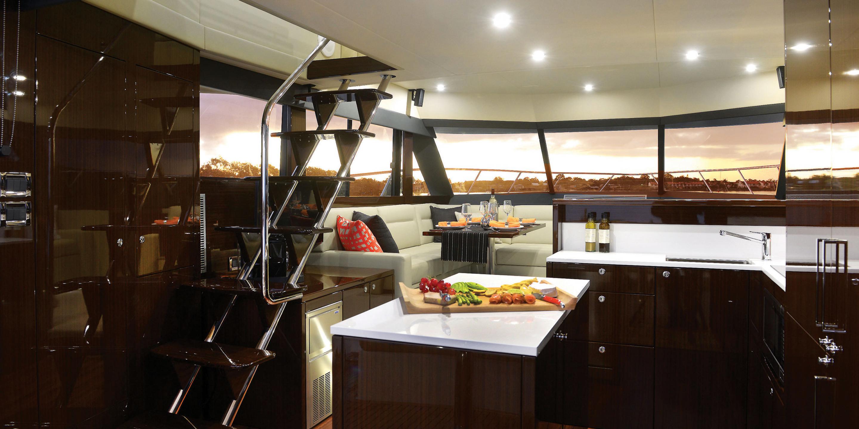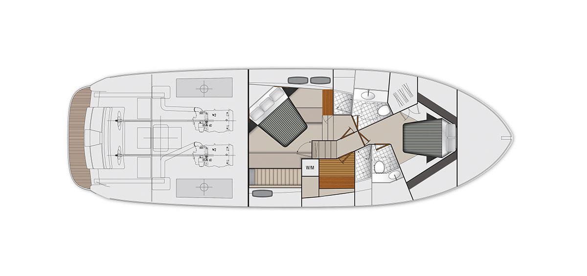The Maritimo M51 combines breathtaking performance and impressive features embodied in the unmistakable Maritimo design – a genuine long-range luxury motor yacht for those looking for space, comfort and power. The first thing you will notice is it loses none of the Maritimo hallmarks: the aft bi-fold doors, internal staircase to the enclosed flybridge (with fold out sofa option) and the walk around decks to the forward end of the windscreen. Maritimo’s advanced hull design and race-bred technology ensure superb balance, poise and fuel efficiency without compromise. But it is the sum of all the details including the impressive full beam master and an innovative third cabin to starboard which can be optioned as a utility room. The aft galley is of generous proportions with ample storage and bi-fold doors opening out to the spacious cockpit entertaining area. The cockpit also boasts an electrically operated lazarette hatch giving full access for tender storage and/or equipment which creates this motor yacht’s quintessential appeal. The flybridge opens up to the outdoors with a three panel sliding window and glass access door.