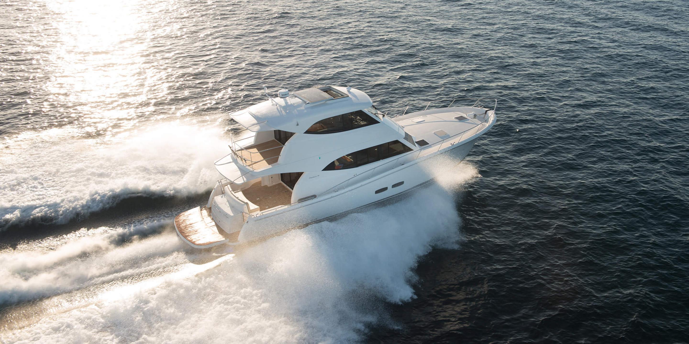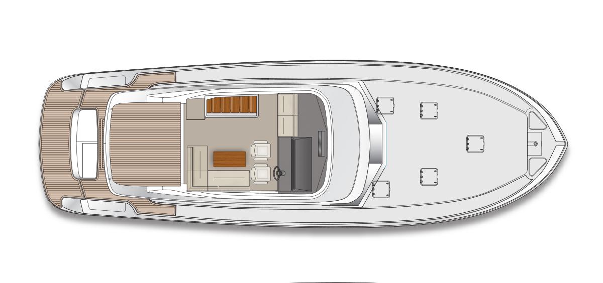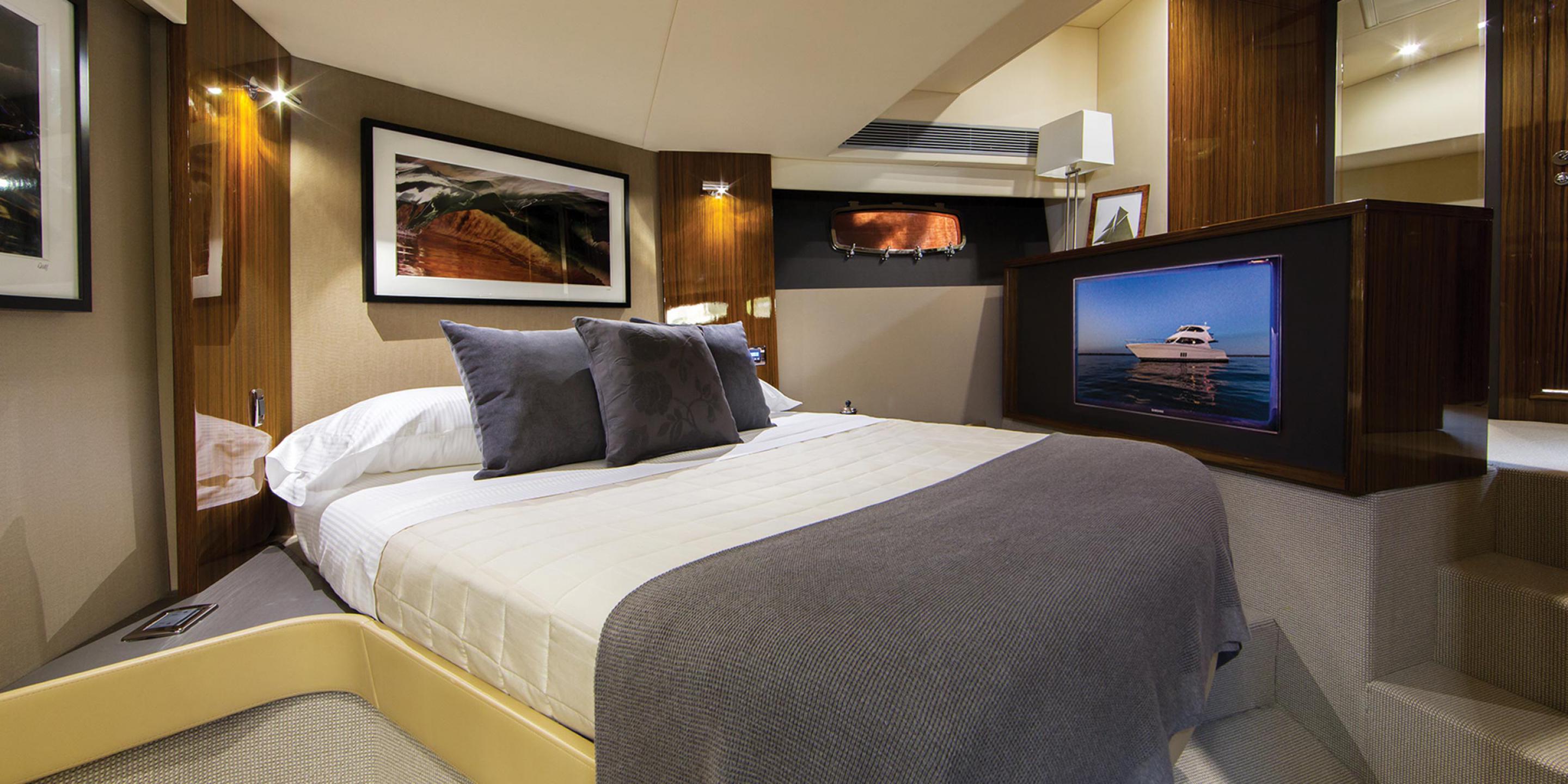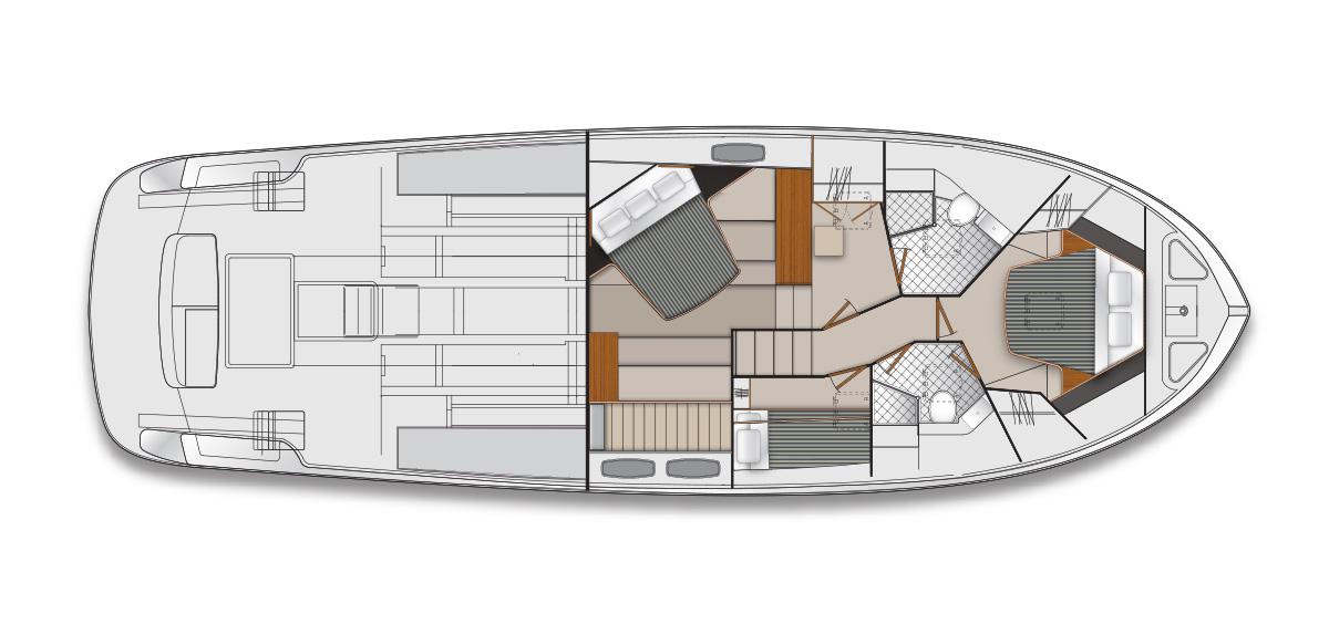 Step aboard the Maritimo M54 and you will notice the wide walk around decks and enlarged cockpit with bi-fold doors which brings the saloon closer than ever. The aft galley design incorporates a full-size fridge and a well-appointed pantry, ideal for easy entertaining. Incorporating a full beam master suite with an abundance of storage in drawers, hanging lockers and underneath the master bed. The mezzanine level above the master has lockers, drawers, a full-length mirror and vanity, ensuring ultimate convenience for all occasions. Your guests are comfortably accommodated in a forward guest suite, bunks to starboard and a day head easily accessed by both areas. The air-conditioned, fully enclosed flybridge is a skipper’s dream capable of fitting three 15” navigation screens. The crew can be accommodated in the optional second helm seat and side lounge, or if preferred, a double helm seat. Walk aft on the flybridge and you will be surprised by the size of the balcony, a large and versatile space for entertaining, relaxing and taking in your stunning surrounds.