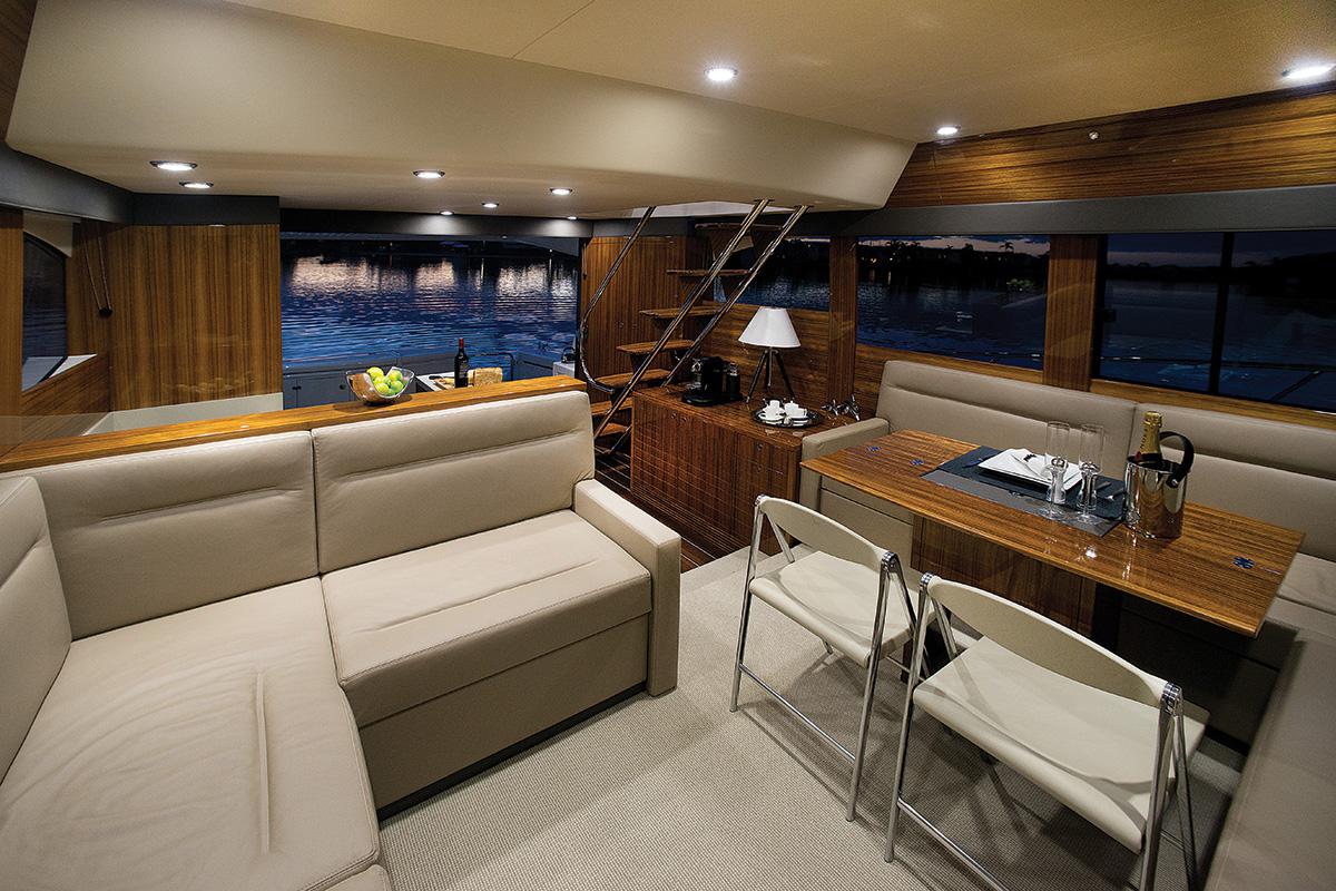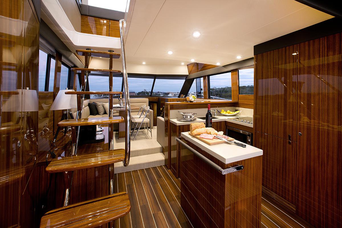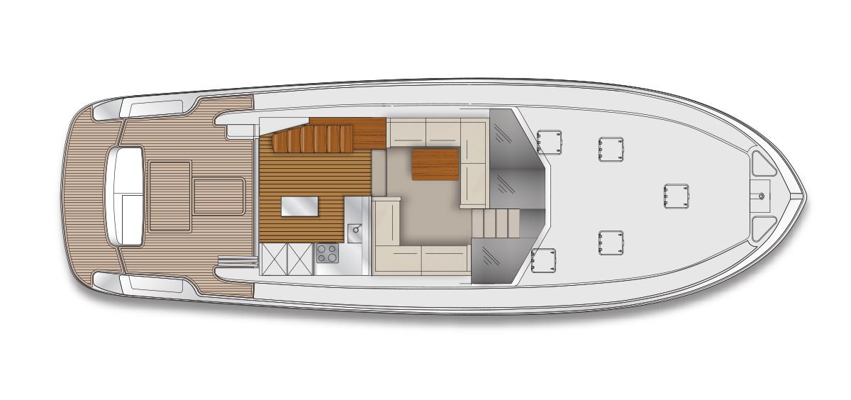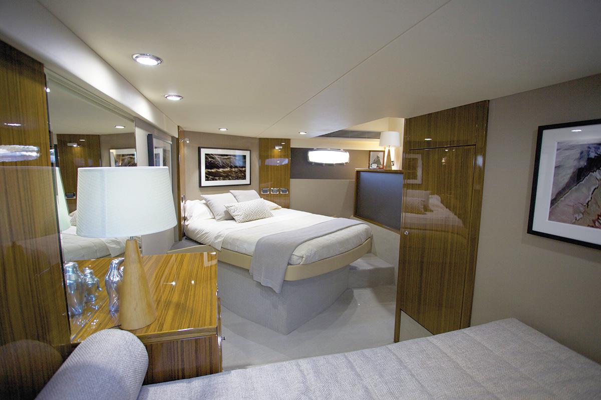 Step aboard the Maritimo M54 and you will notice the wide walk around decks and enlarged cockpit with bi-fold doors which brings the saloon closer than ever. The aft galley design incorporates a full-size fridge and a well-appointed pantry, ideal for easy entertaining. Incorporating a full beam master suite with an abundance of storage in drawers, hanging lockers and underneath the master bed. The mezzanine level above the master has lockers, drawers, a full-length mirror and vanity, ensuring ultimate convenience for all occasions. Your guests are comfortably accommodated in a forward guest suite, bunks to starboard and a day head easily accessed by both areas. The air-conditioned, fully enclosed flybridge is a skipper’s dream capable of fitting three 15” navigation screens. The crew can be accommodated in the optional second helm seat and side lounge, or if preferred, a double helm seat. Walk aft on the flybridge and you will be surprised by the size of the balcony, a large and versatile space for entertaining, relaxing and taking in your stunning surrounds.