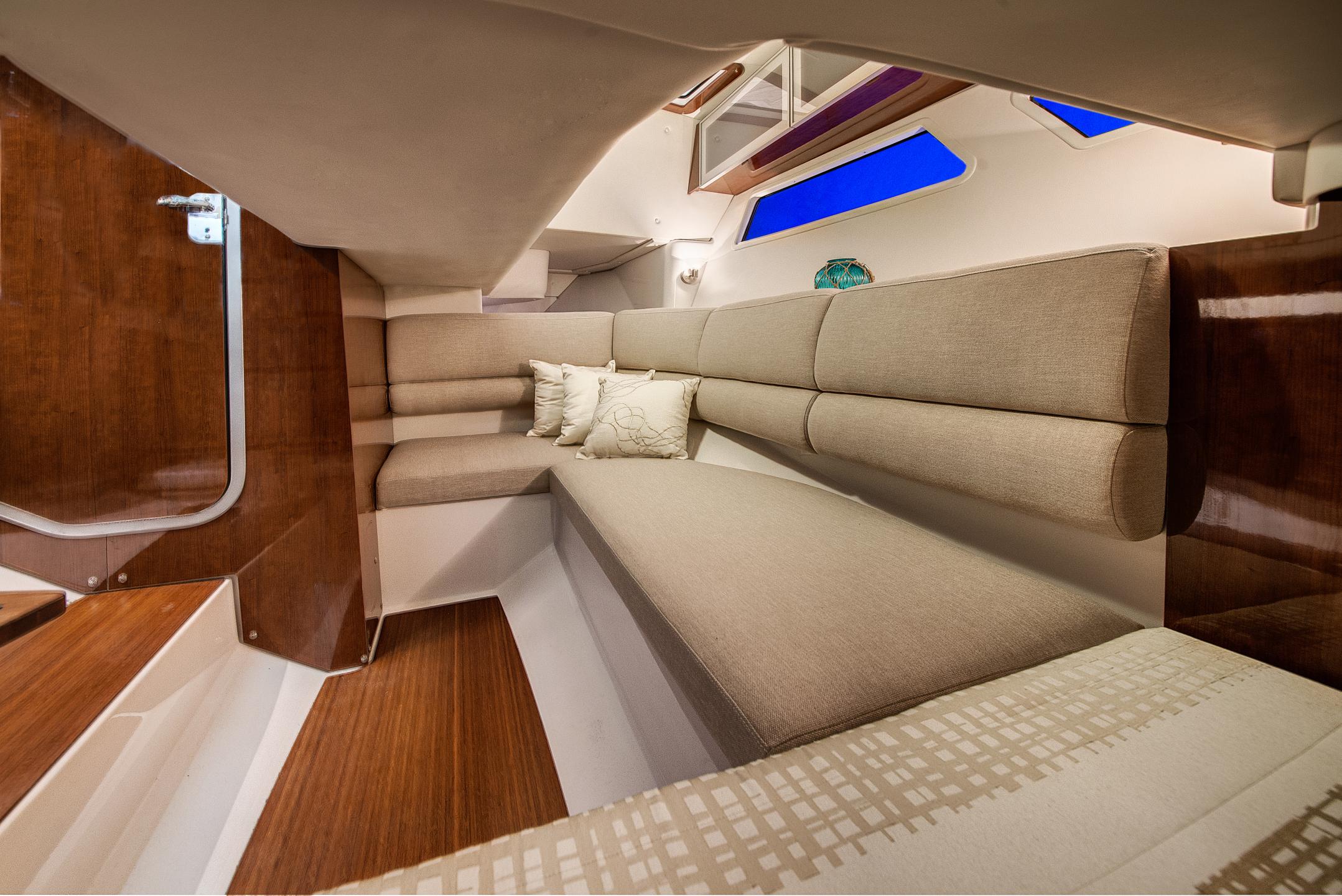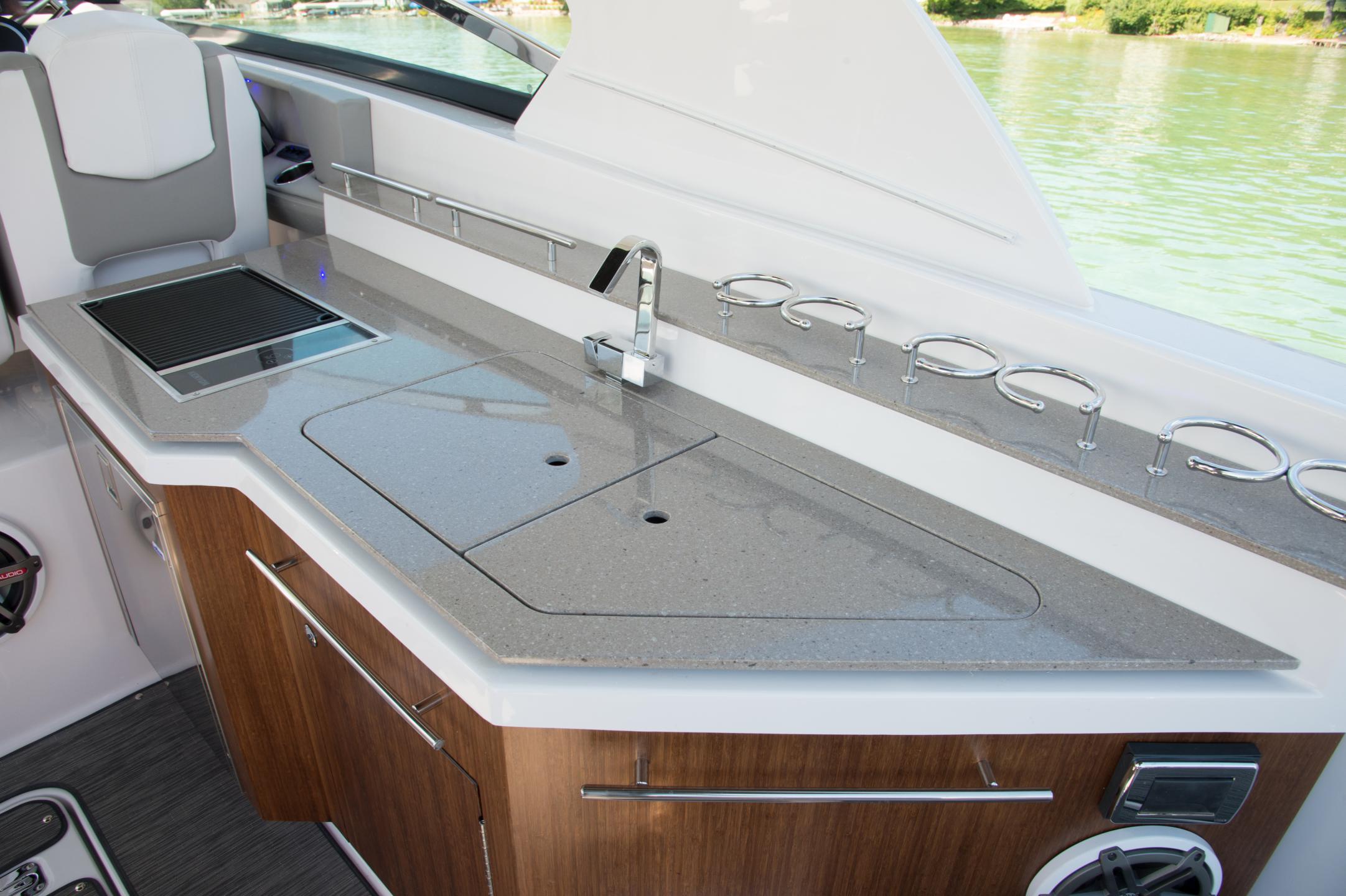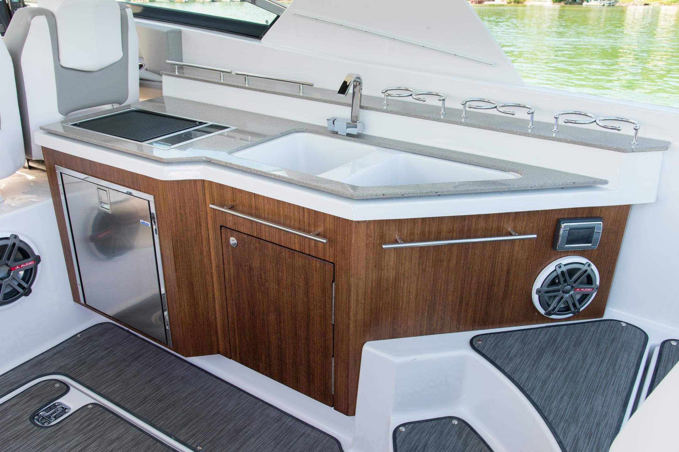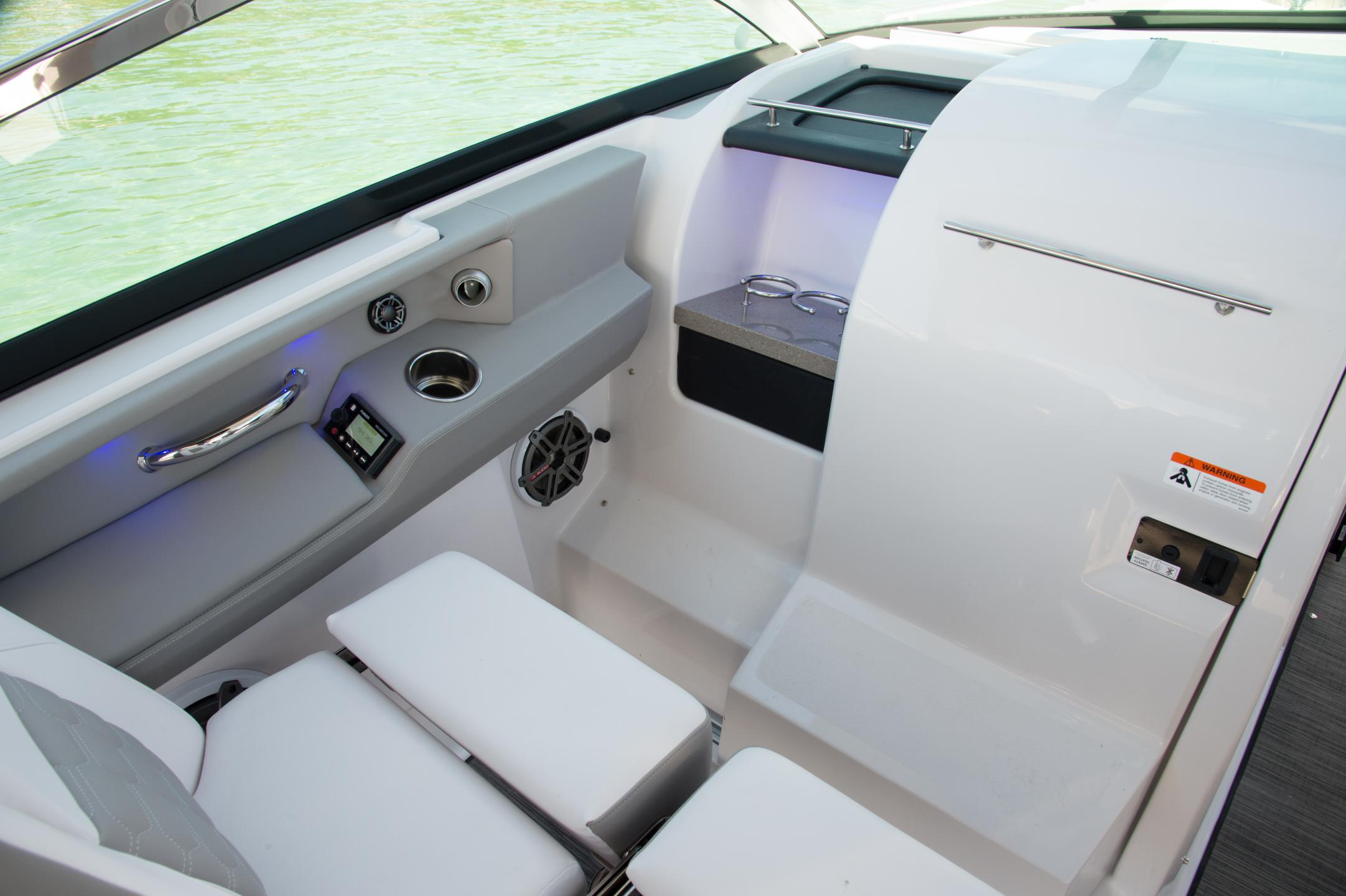 Treat your family and friends to a spectacular day on the water in the Horizon 350—a luxury Bowrider that has the benefits of a comfortable cabin. Equipped with a fully functional head, this boat was inspired to be your home away from home. The unique cockpit design is laid out perfectly, and the duel swiveling cockpit seats provide plenty of room at the helm. With the Horizon 350, you have a roomy, well-appointed boat that’s ideal for hosting friends and family, above or below deck.