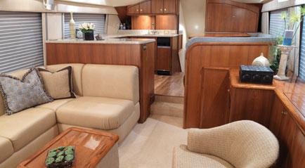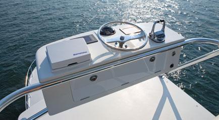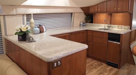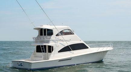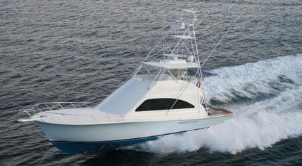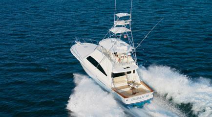 The 58 Super Sport stands at the intersection of the latest trends in naval architecture and engineering, some of which have been pioneered in Ocean’s recent models. She has a sheltered cockpit mezzanine, for example, introduced on our 73 Super Sport and, later, adapted for our 54 Super Sport. It oversees the sportfishing drama, or cockpit “play.” Up on the impressive flybridge, a center-console helm creates a fluid space, which also characterizes the main-cabin layout, where salon, galley, and dinette areas are integrated. The 58 SS rides dry and smooth in roughest sea conditions on Ocean’s refinement of the planing hull – acknowledged by many to be the most seaworthy hullform in production yachting. Unique pocketed propeller tunnels, designed for use with an ordinary trim-tab system, admit the yacht to shallow passages. The yacht is easily captained by her owners. At times, however, even the most dedicated skipper may wish to turn over the wheel to a captain; the 58 SS’s third stateroom and head accommodates two crew members in comfort. Offshore travelers enjoy comforts and amenities seldom encountered on comparable boats – in part because of Ocean’s insistence on offering more standard equipment than any competitive manufacturer. The elegant teak-accented salon is graced with rich furnishings and deluxe entertainment equipment. The new U-shaped galley has everything needed to appease salt air-sharpened appetites. The separate dinette is expansive and convenient within the 58 SS’s fluid main-deck plan. Few yachts this size have been so perfectly engineered for sportfishing. Or extended offshore living. The 58 Super Sport represents, in the sum of her innovations, the new Ocean. She demonstrates the company’s commitment to produce sportfising boats that will leave boaters breathless with admiration and competitors breathlessly trying to catch up. Every Ocean Yacht is backed by a transferable 5 -Year Limited Structural Hull Warranty. Five-Year Engine and Generator Limited Warranties are extended by the respective manufacturers. Ocean was the first manufacturer in the industry to offer such owner protection and peace of mind.